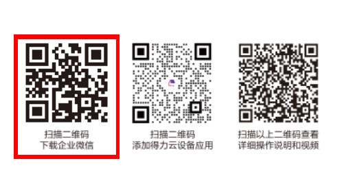 • 蓝牙配网:使用企业微信扫描“得力云设备应用”二维码并添加,按照页面提示进行配网,并绑定设备