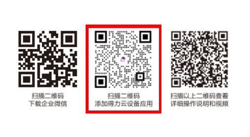 • 打开企业微信扫一扫,扫描门禁机界面二维码,按照页面提示设置,并添加得力云设别应用,及绑定设备。